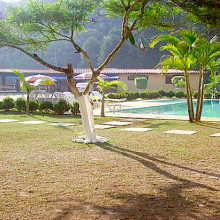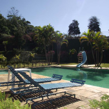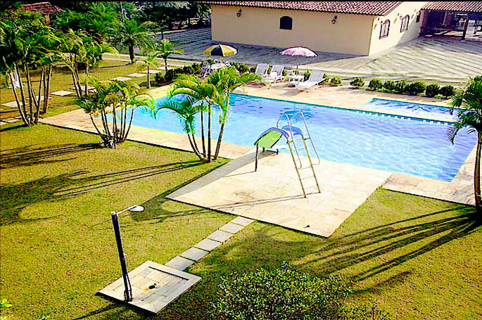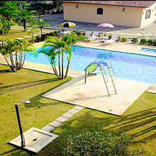 Piscinas adulto e infantil com toboáguas, com vestiários masculinos e femininos, playground com espaço para montagem de outros brinquedos infantis e inflaveis.